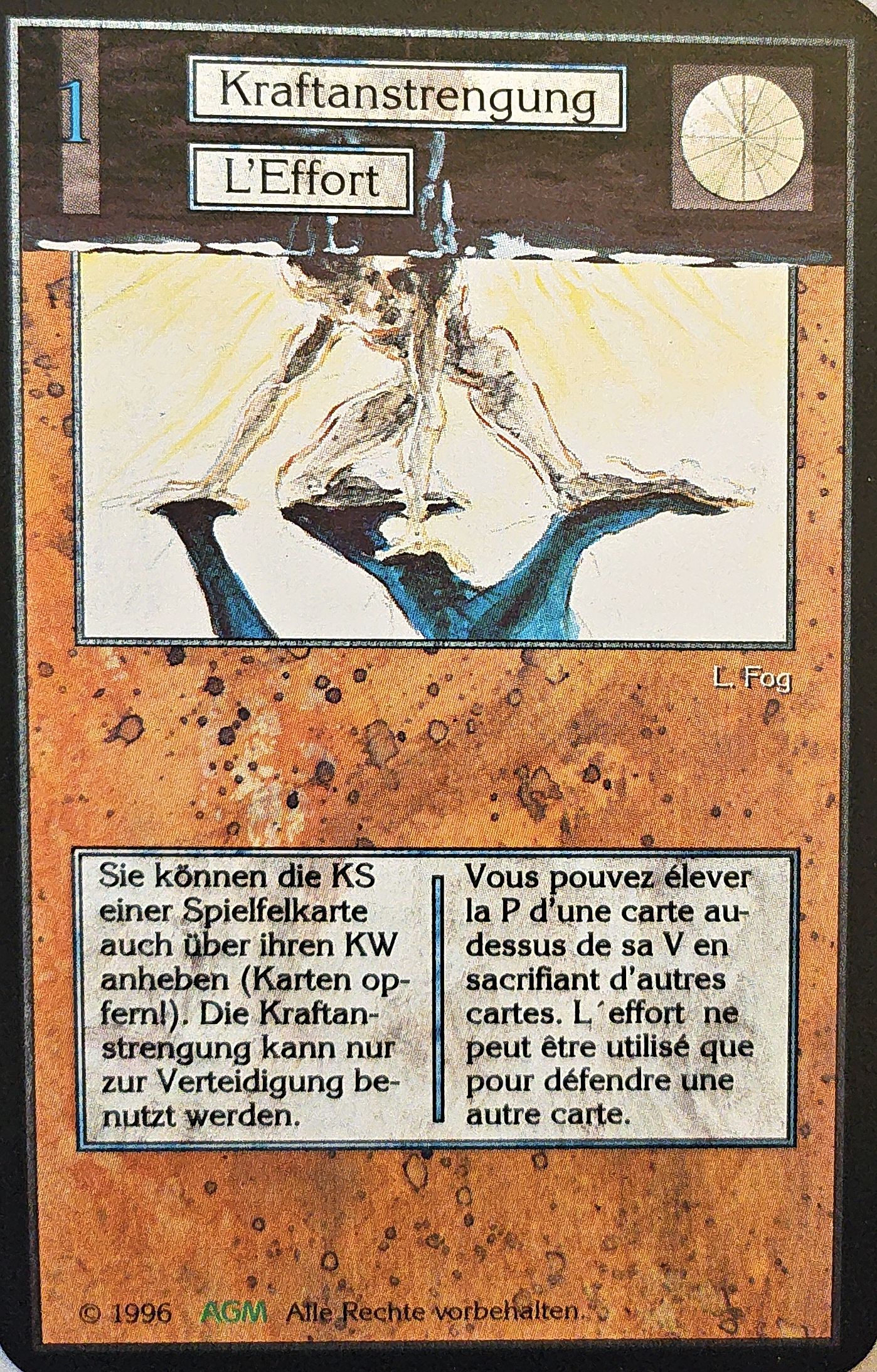 | Sie können die KS einer Spielfeldkarte auch über ihren KW anheben (Karten op fernl) Die Kraftan- strengung kann nur Verteidigung be- nutzt werden | Vous pouvez élever la P d’une carte au dessus de sa V en sacrifiant d’autres cartes. L effort peut être utilisé que pour défendre une autre carte. |