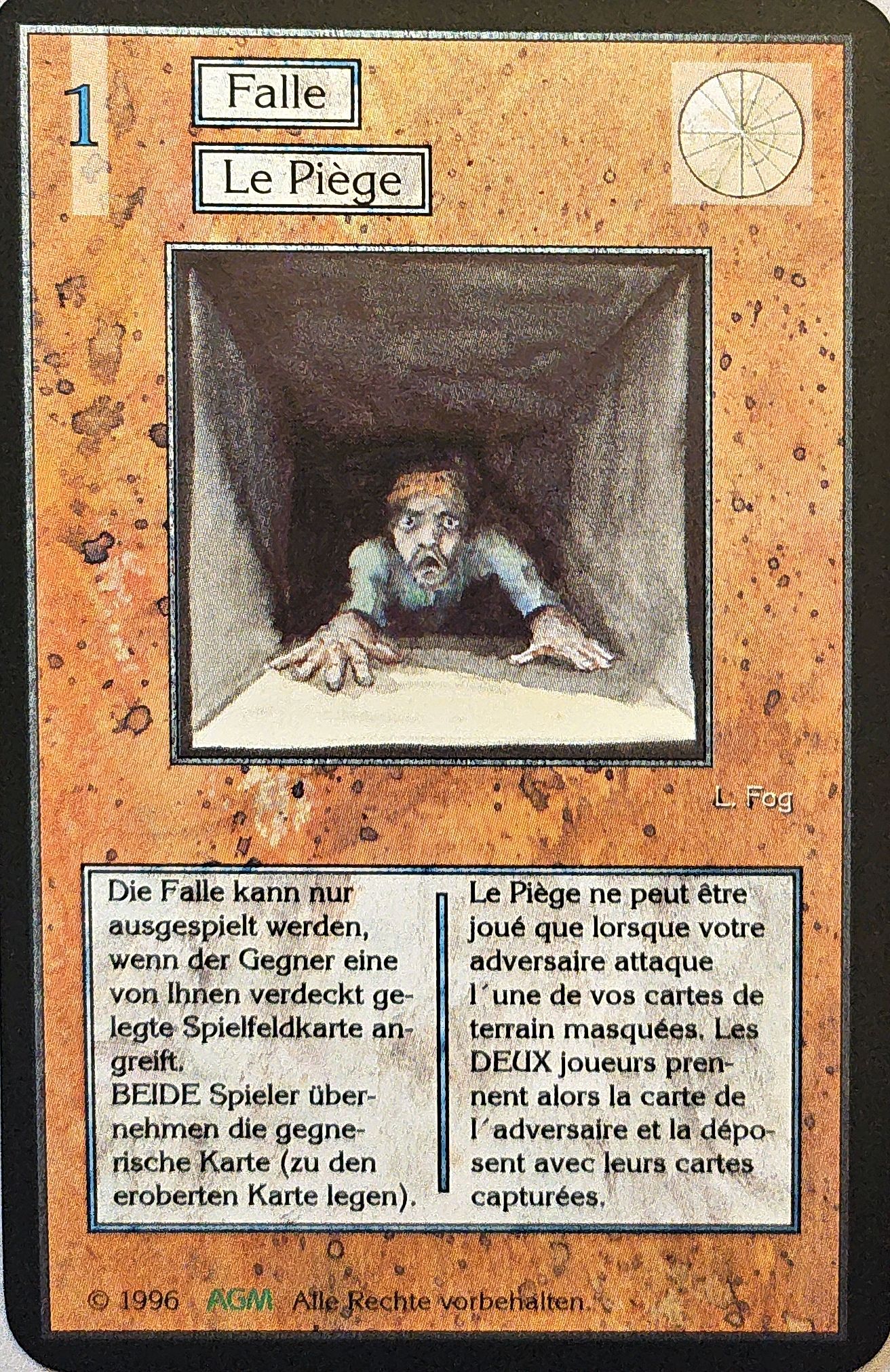 | Die Falle kann nur ausgespielt werden, wenn der Gegner eine von Ihnen verdeckt ge- legte Spielfeldkarte an greift, BEIDE Spieler uber- nehmen die gegne- rische Karte (zu den eroberten Karte legen) | ne peut être joué que lorsque votre adversaire attaque 1’une de vos cartes de terrain masquées, Les DEUX joueurs pren nent alors la carte de Vadversaire et la sent avec leurg cartes capturées, Piège dépo |