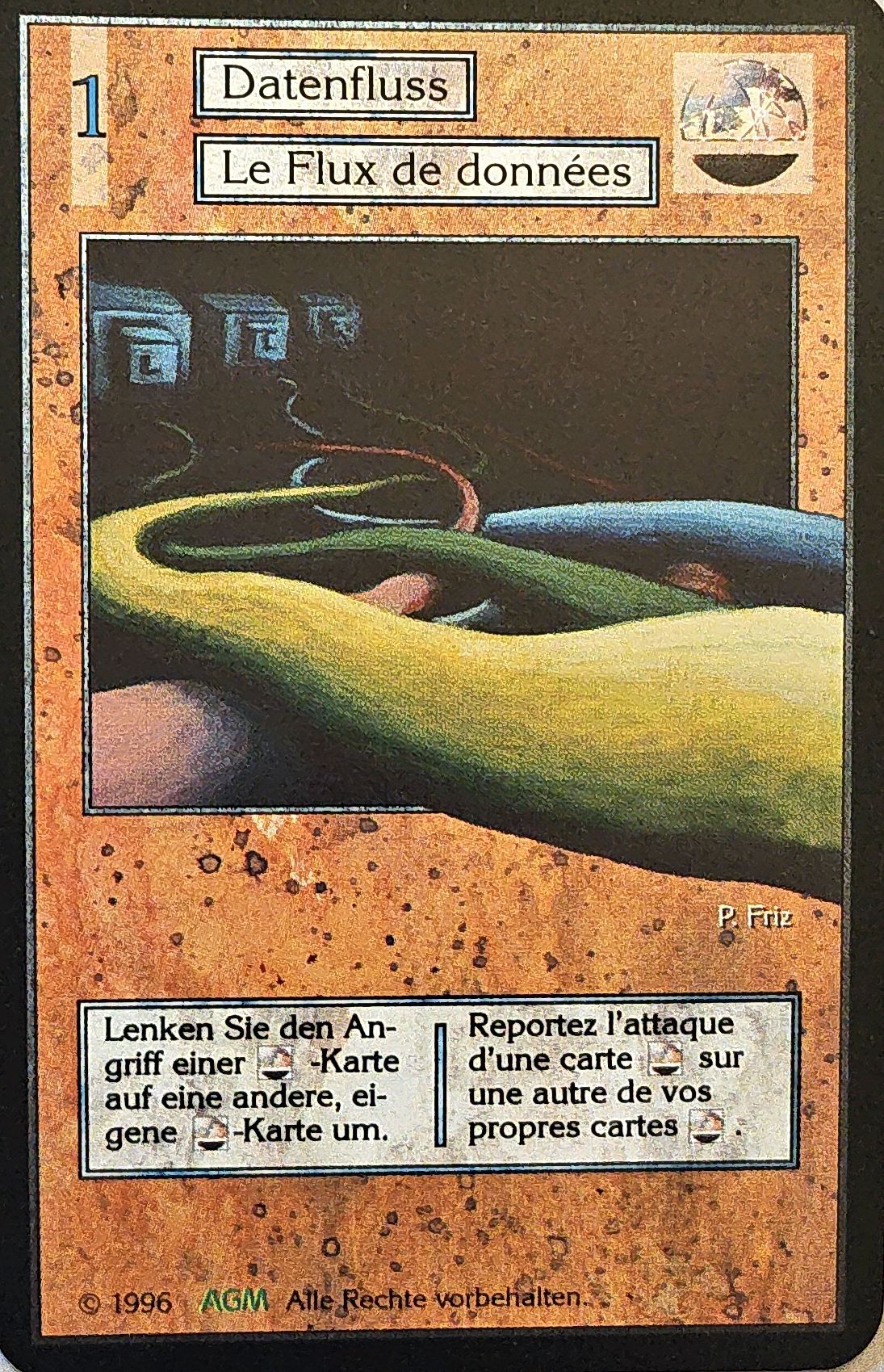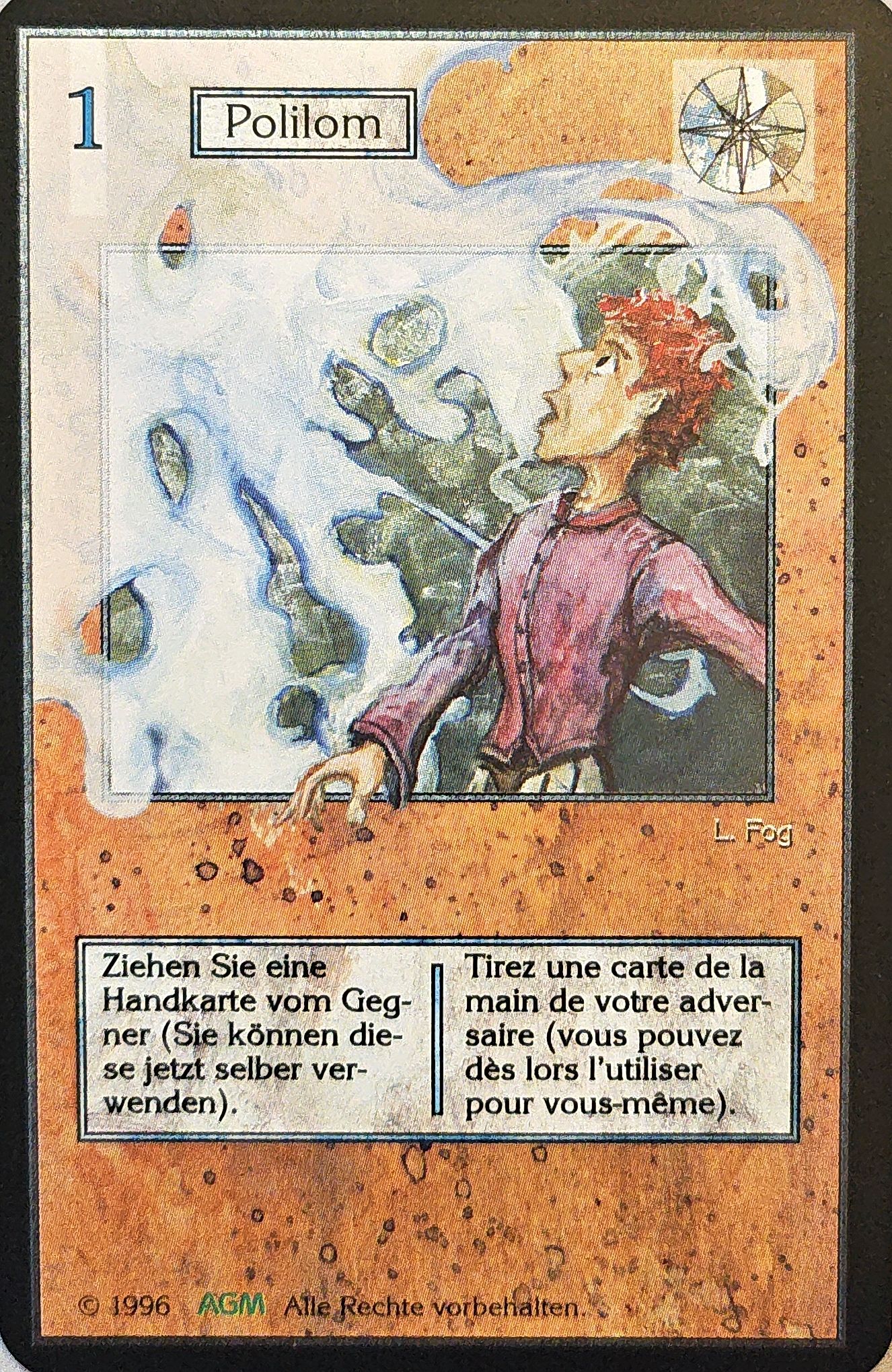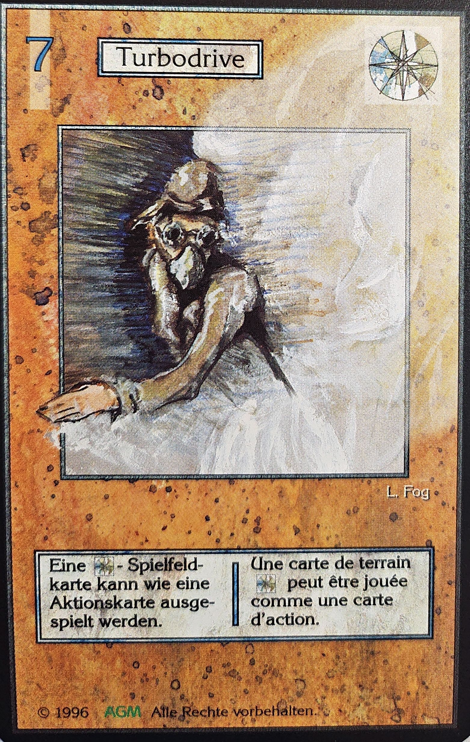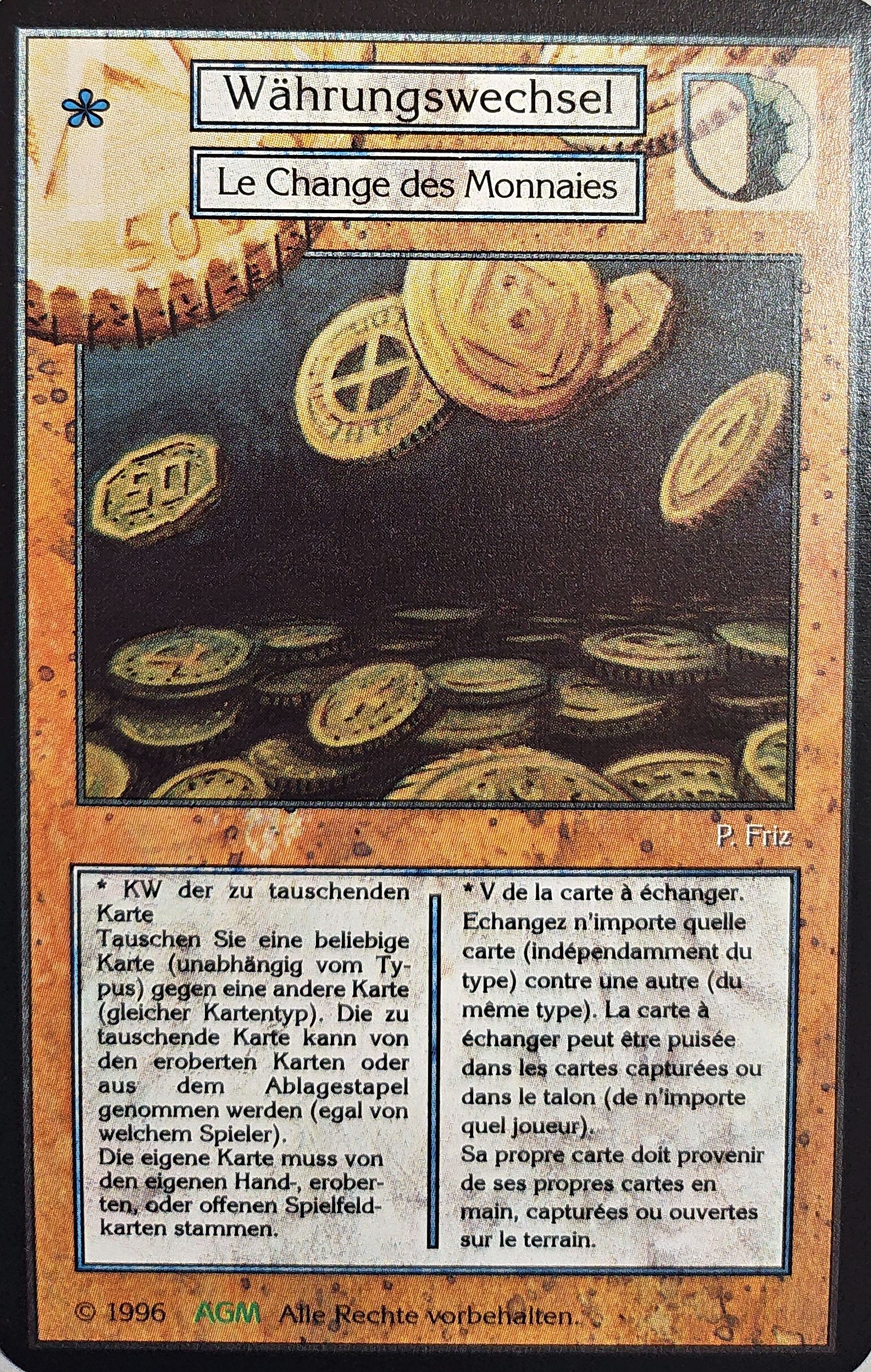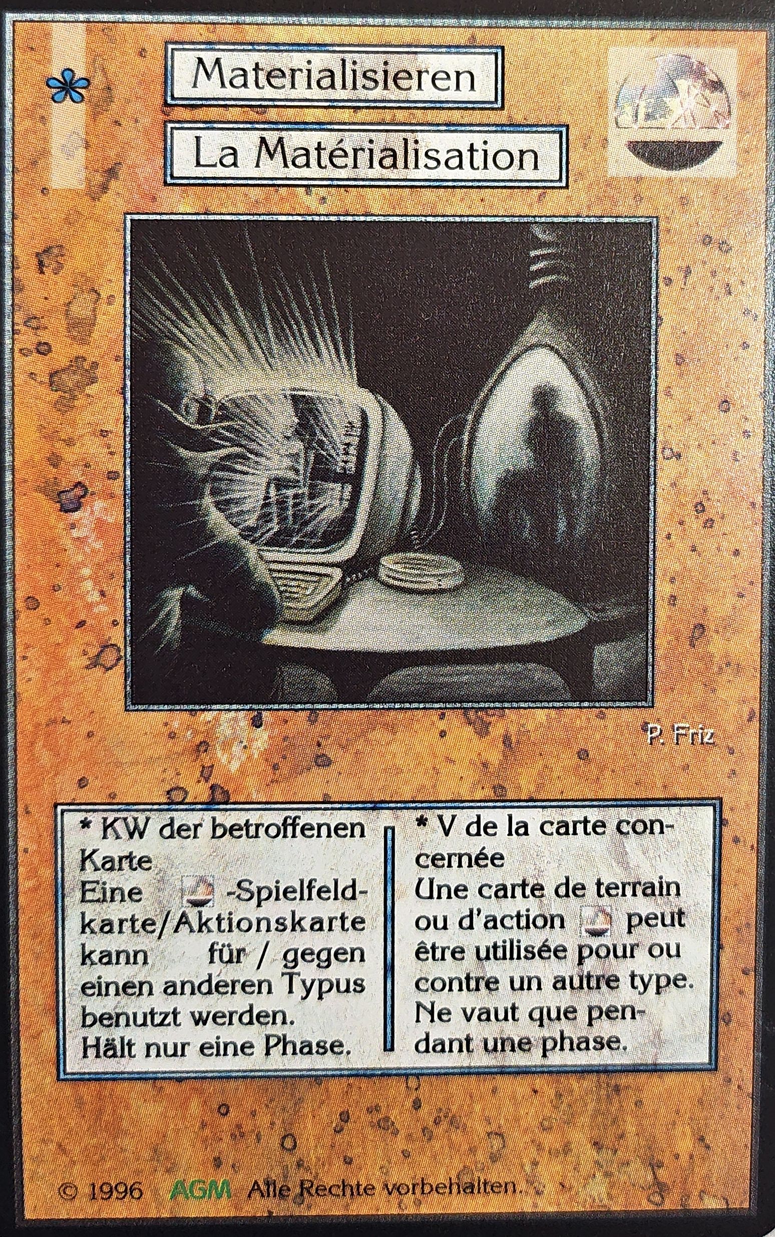 | KW der betroffenen Karte Eine ~Spielfeld - karte/ Aktionskarte kann gegen einen anderen Typus benutzt werden. Hält nur eine Phase. | Vde la carte con cernée Une carte de terrain ou daction peut être utilisée pour ou contre un autre type. Ne vaut que pen dant une phase. |