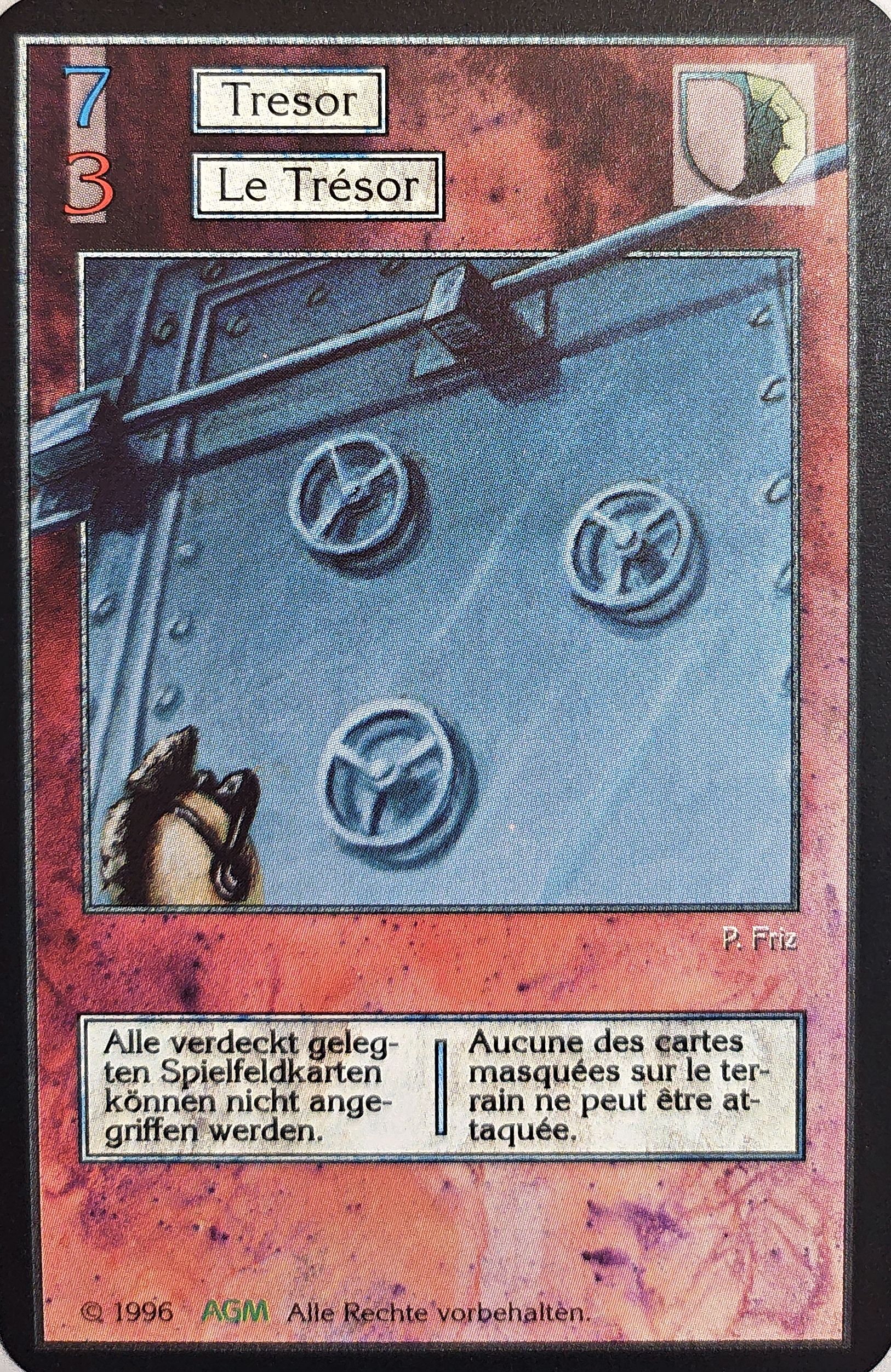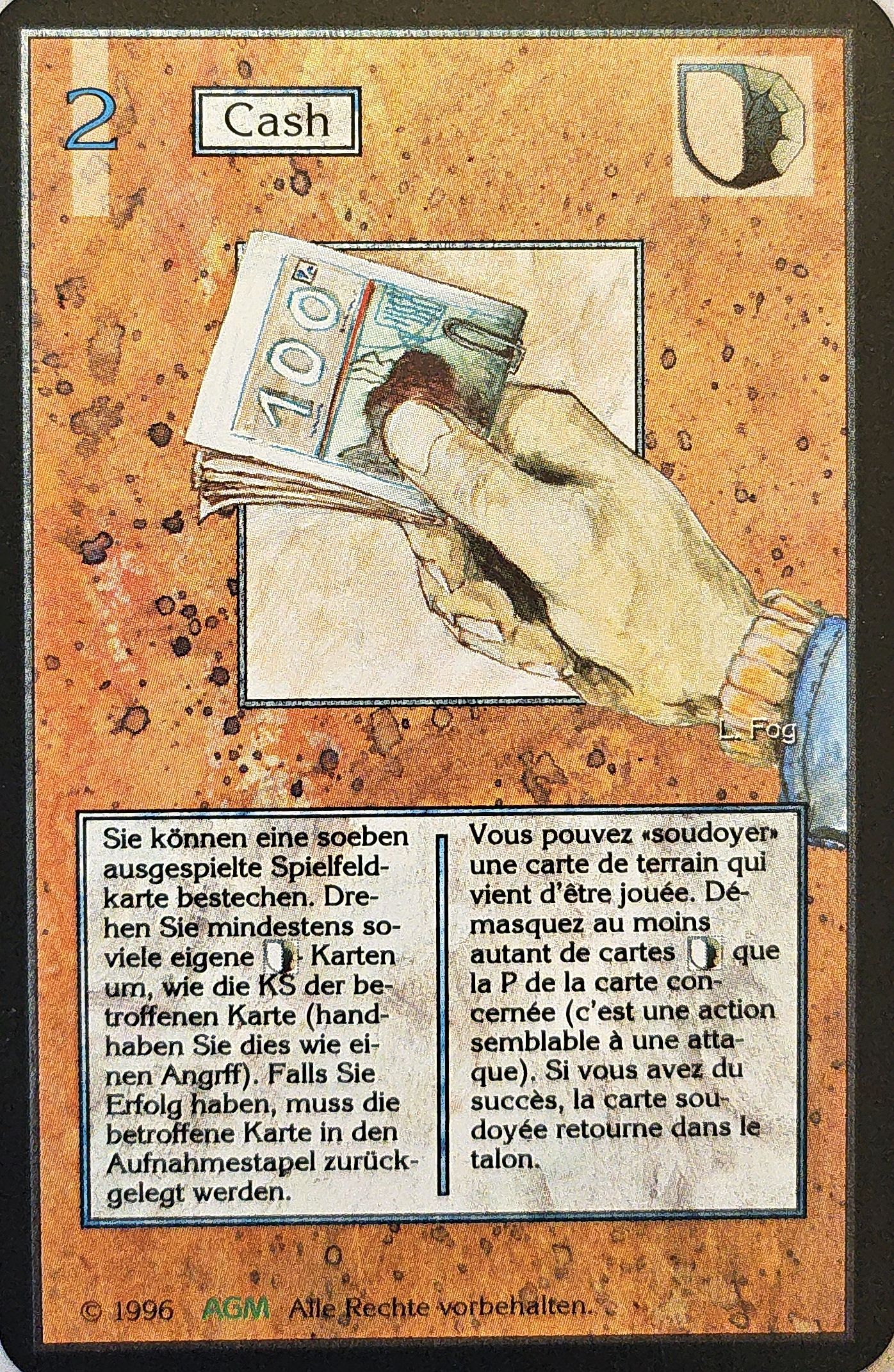 | Sie können eine soeben ausgespielte Spielfeld- karte bestechen. Dre- hen Sie mindestens so- viele eigene Karten wie die KS der be troffenen Karte (hand haben Sie dies wie ei- nen Angrff) . Falls Sie Erfolg haben, muss die betroffene Karte in den Aufnahmestapel zurück- gelegt werden. | Vous pouvez “soudoyer” une carte de terrain vient d’être jouée. Dé masquez au moins autant de cartes la P de la carte con cernée (c’est une action semblable à une atta que). Si vous avez du succès, la carte sou doyée retourne dans le talon |