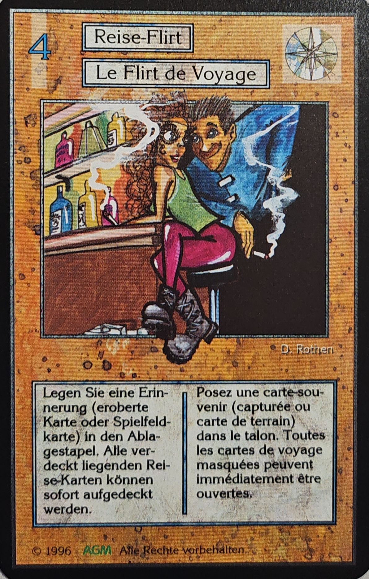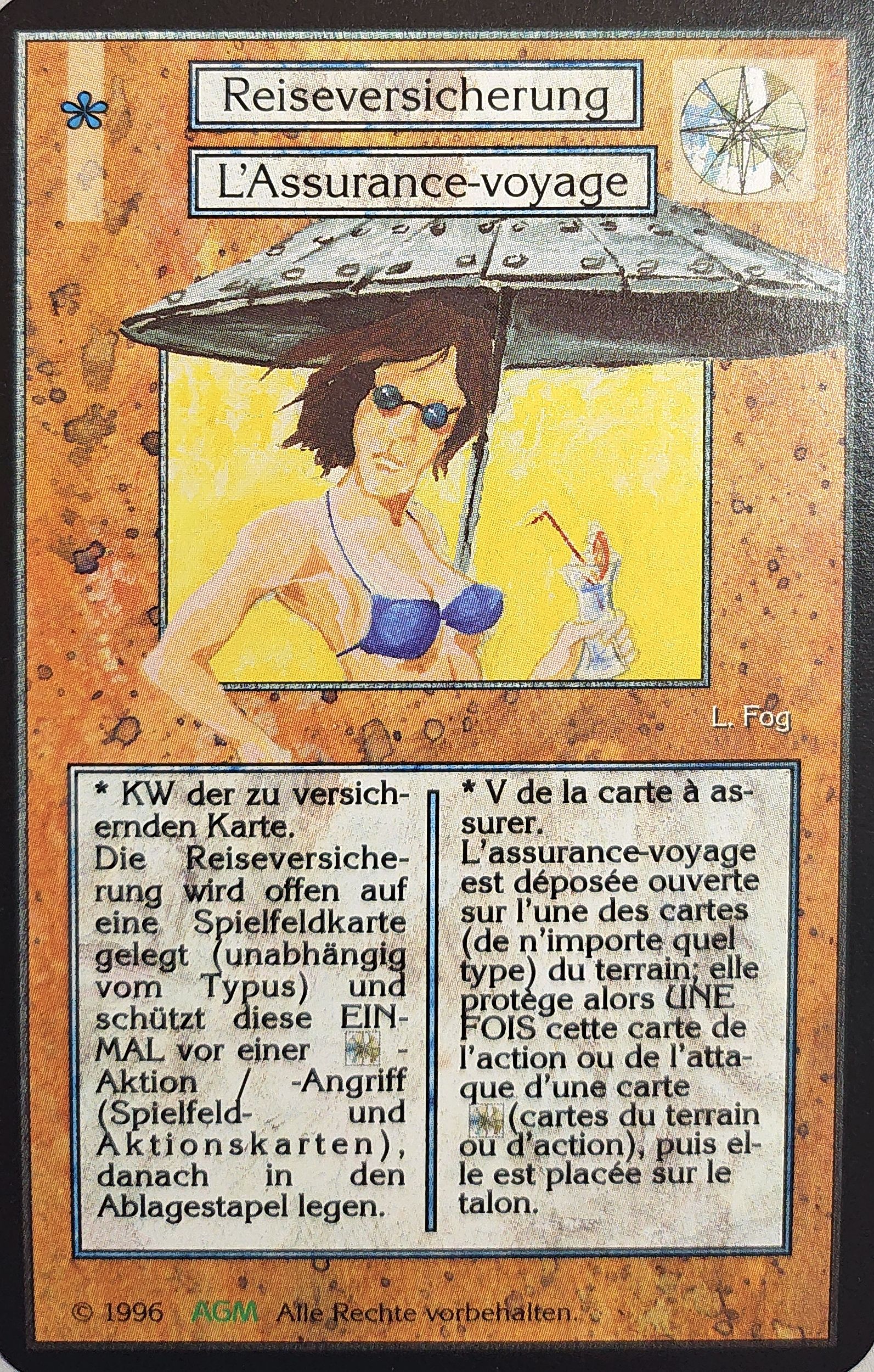 | ChIQeI AaLUC Reiseversiche- rung wird offen eine Spielfeldkarte gelegt ypabhängiq Typus) schützt diese EIN- MAL vor einer Aktion Angriff {Spialelak artena danach Ablagestapel legen. | Juryie L’assurance-voyage est déposée ouverte sur l’une des cartes (de n’importe type) du terrain elle alors CNE Potsge cette carte de Taction ou de latta - que d’une carte du terrain Gaction)u le est placée sur le talon: quel puis |