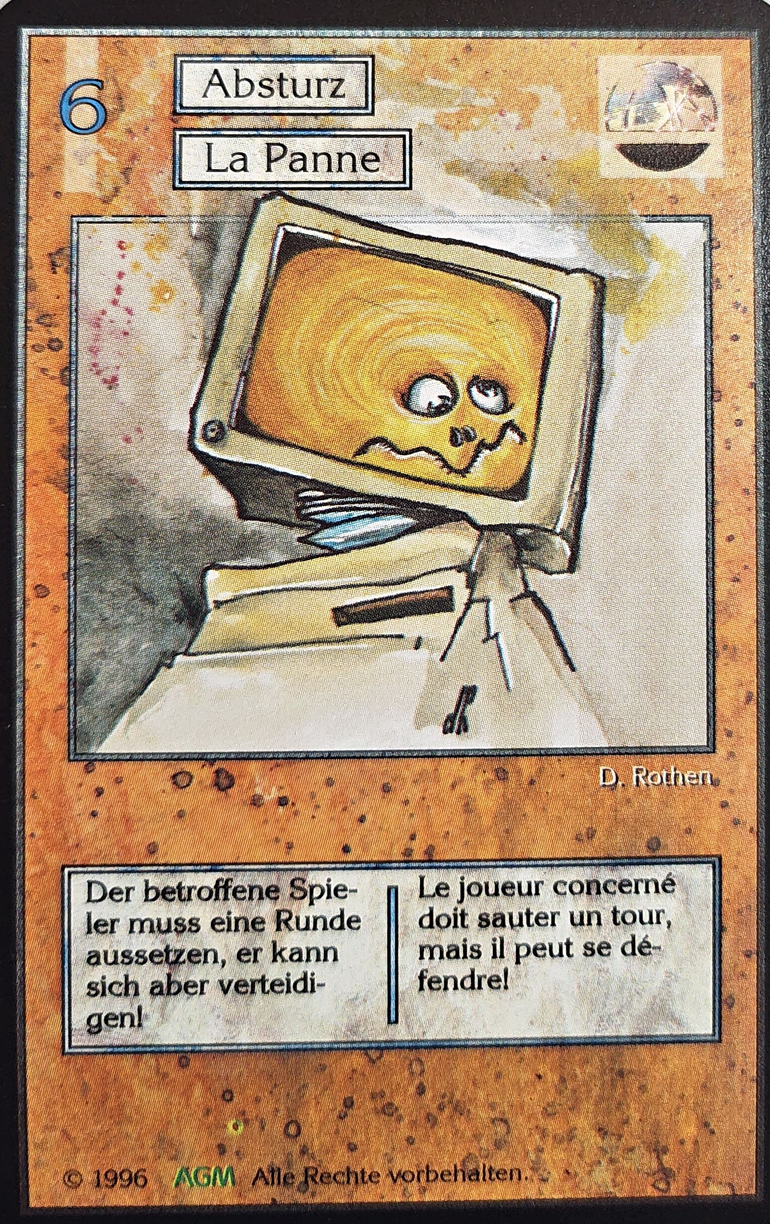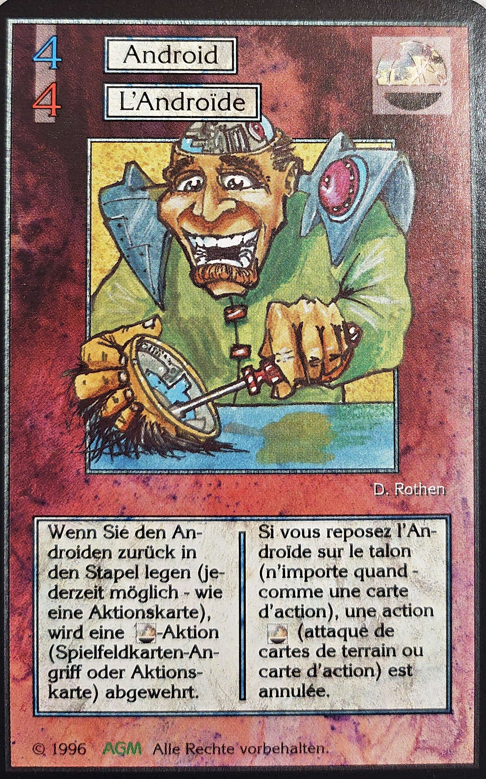 | Wenn Sie den An- droiden zurück in den Stapel legen (je- derzeit möglich eine Aktionskarte) , wird eine Aktion (Spielfeldkarten-An- oder Aktions- karte) abgewehrt. griff | Rothen Si vous reposez l’An droide sur le talon (n’importe quand comme une carte d’action) , une action (attaque de cartes de terrain ou carte daction) est annulée. |
