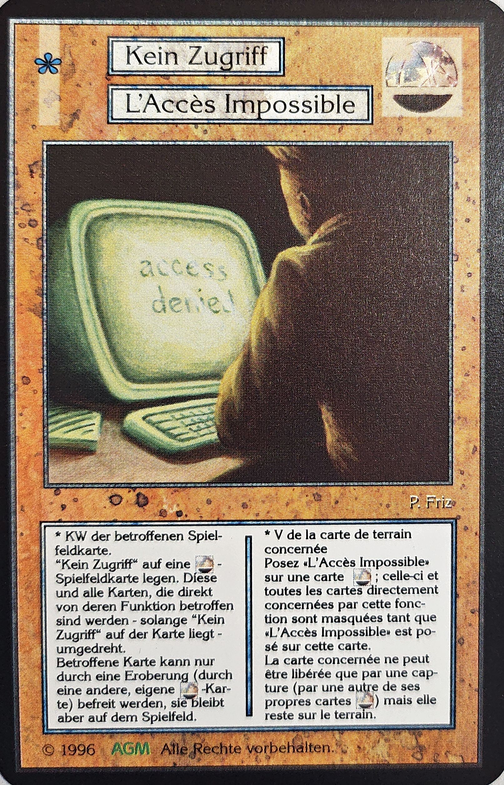 | KW der betroffenen Spiel- feldkarte. “Kein Zugriff” auf eine Spielfeldkarte legen. Diese und alle Karten, die direkt von deren Funktion betroffen sind werden solange “Kein Zugriffu auf der Karte liegt umgedreht; Betroffene Karte kann nur durch eine Eroberung (durch eine andere, eigene Kar- te) befreit werden, sië Bleibt aber auf dem Spielfeld. | Vde la carte de terrain concernée Posez ‘L’Accès Impossible” sur une carte celle ci et toutes les cartes directement concernées par cette fonc- tion sont masquées tant que “L’Accès Impossiblew est po- sé sUT cette carte. La carte concernée ne être libérée que par une cap- ture (par une autre de ses propres cartes mais elle reste sur le terrain. peut |