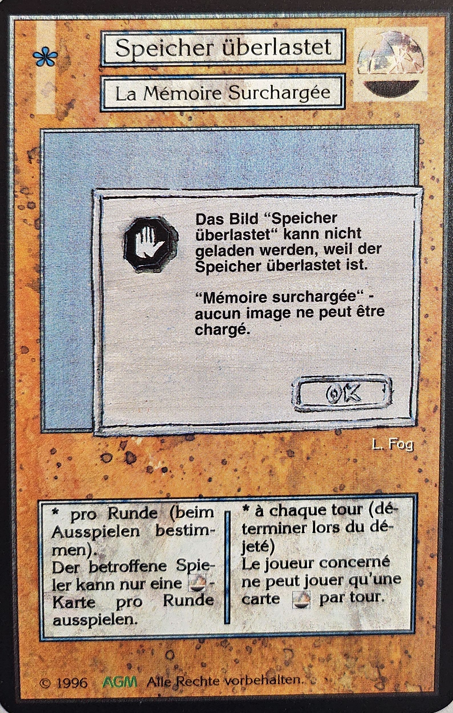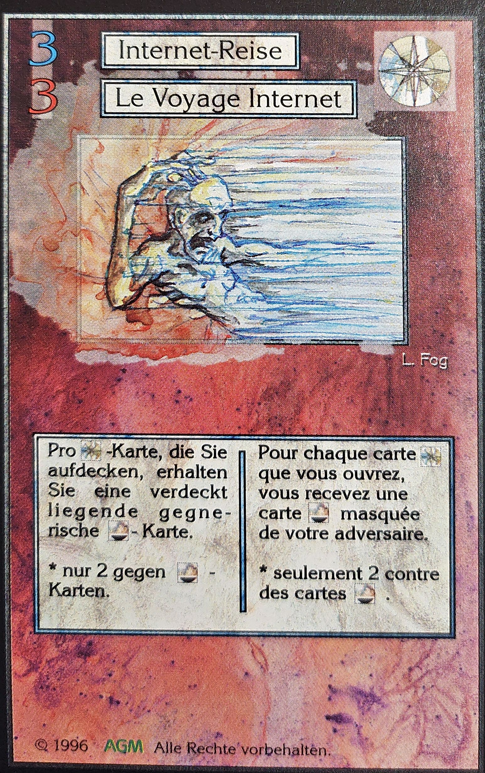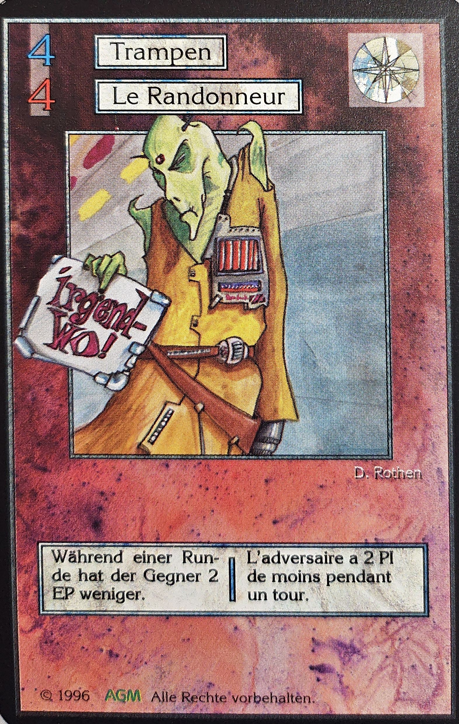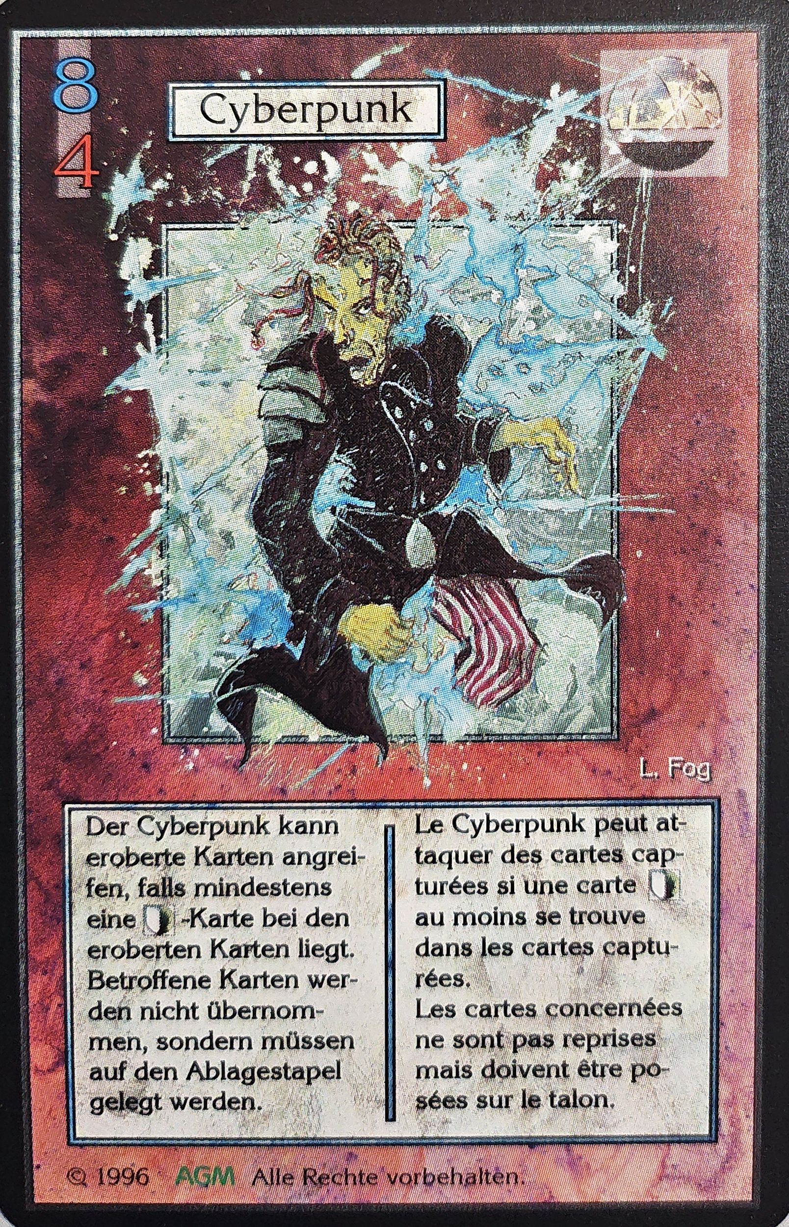 | Der Cyberpunk kann eroberte Karten angrei falls mindestens eine ~Karte bei den eroberten Karten liegt. Betroffene Karten wer- den nicht ubernom men, sondern mussen auf den Ablagestapel gelegt werden: fen; | Le Cyberpunk peut at taquer des cartes cap turées si une carte au moins se trouve dans les cartes captu rées Les cartes concernées ne sont pas reprises mais doivent être po sées sur le talon; |