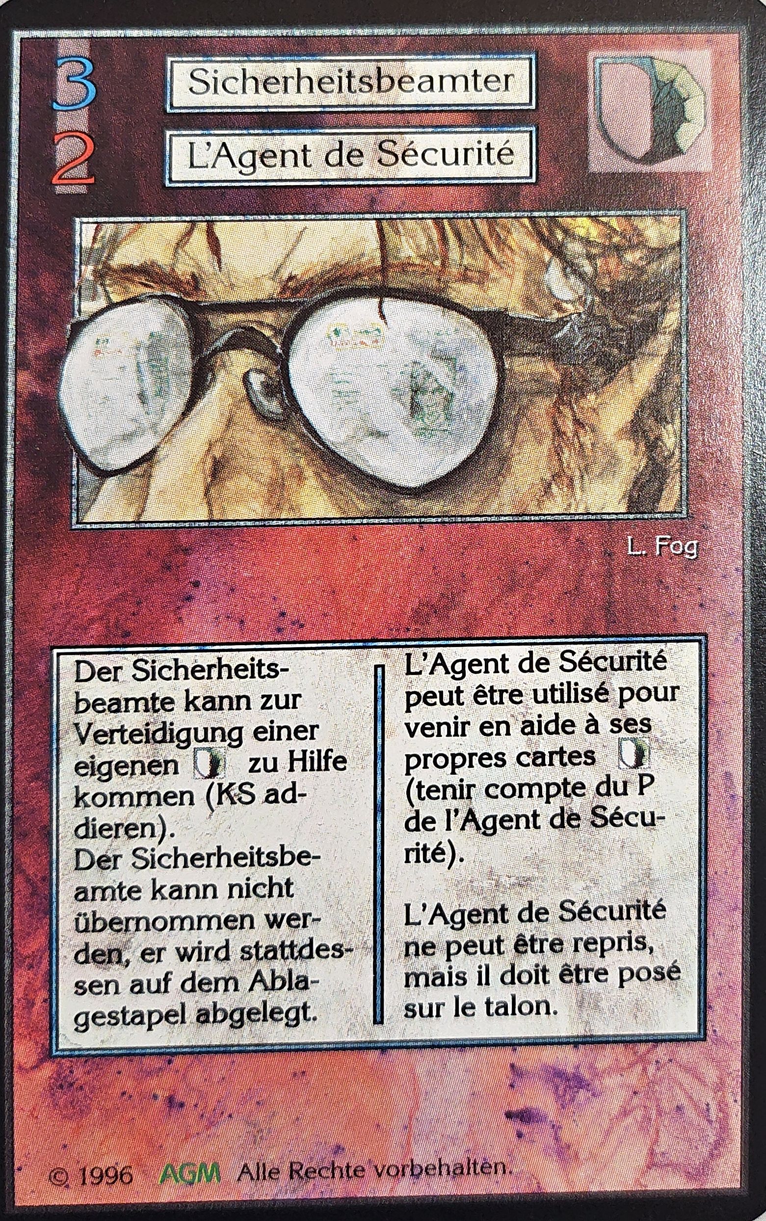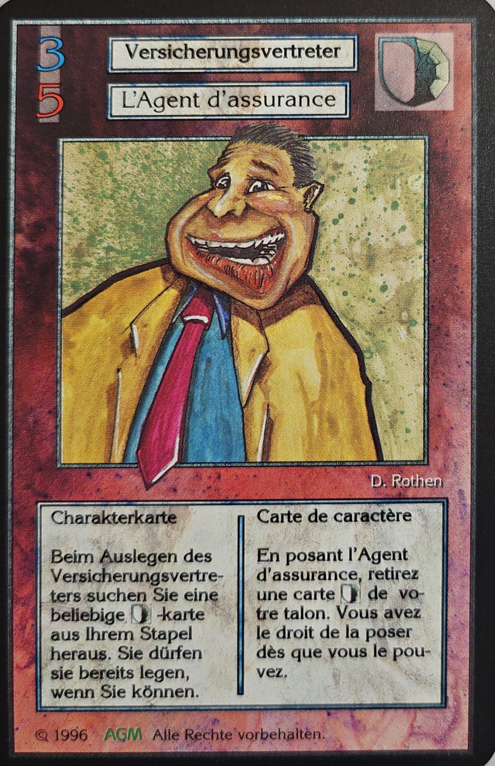 | Charakterkarte Beim Auslegen des Versicherungsvertre- ters suchen Sie eine beliebige ~karte aus Ihrem Stapel heraus. Sie dürfen sie bereits legen, wenn Sie können. | Rothen Carte de caractère En posant l’Agent dassurance, retirez une carte tre talon: Vous avez le droit de la poser dès que vous le pou vez. |