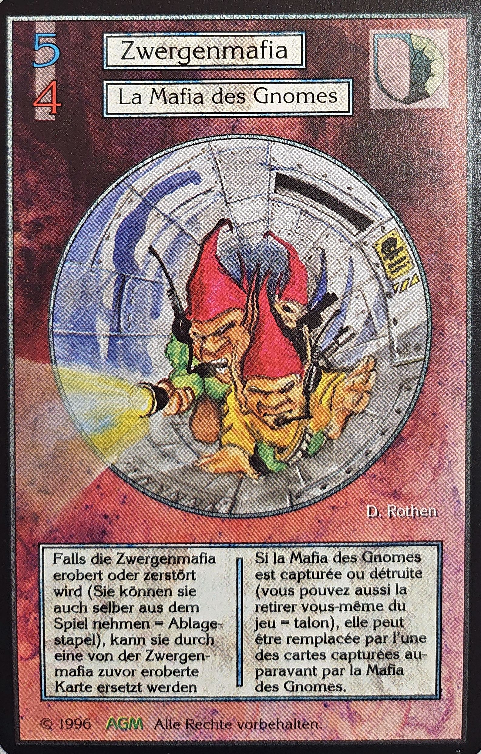 | Falls die Zwergenmafia erobert oder zerstört wird (Sie können sie auch selber aus dem Spiel nehmen Ablage stapel) , kann sie durch eine von der Zwergen mafia zuvor eroberte Karte ersetzt werden | Rothen Si la Mafia des Gnomes capturée ou détruite (vous pouvez aussi la retirer vous-même du talon) , elle peut être remplacée par lune des cartes capturées au paravant par la Mafia des Gnomes. |