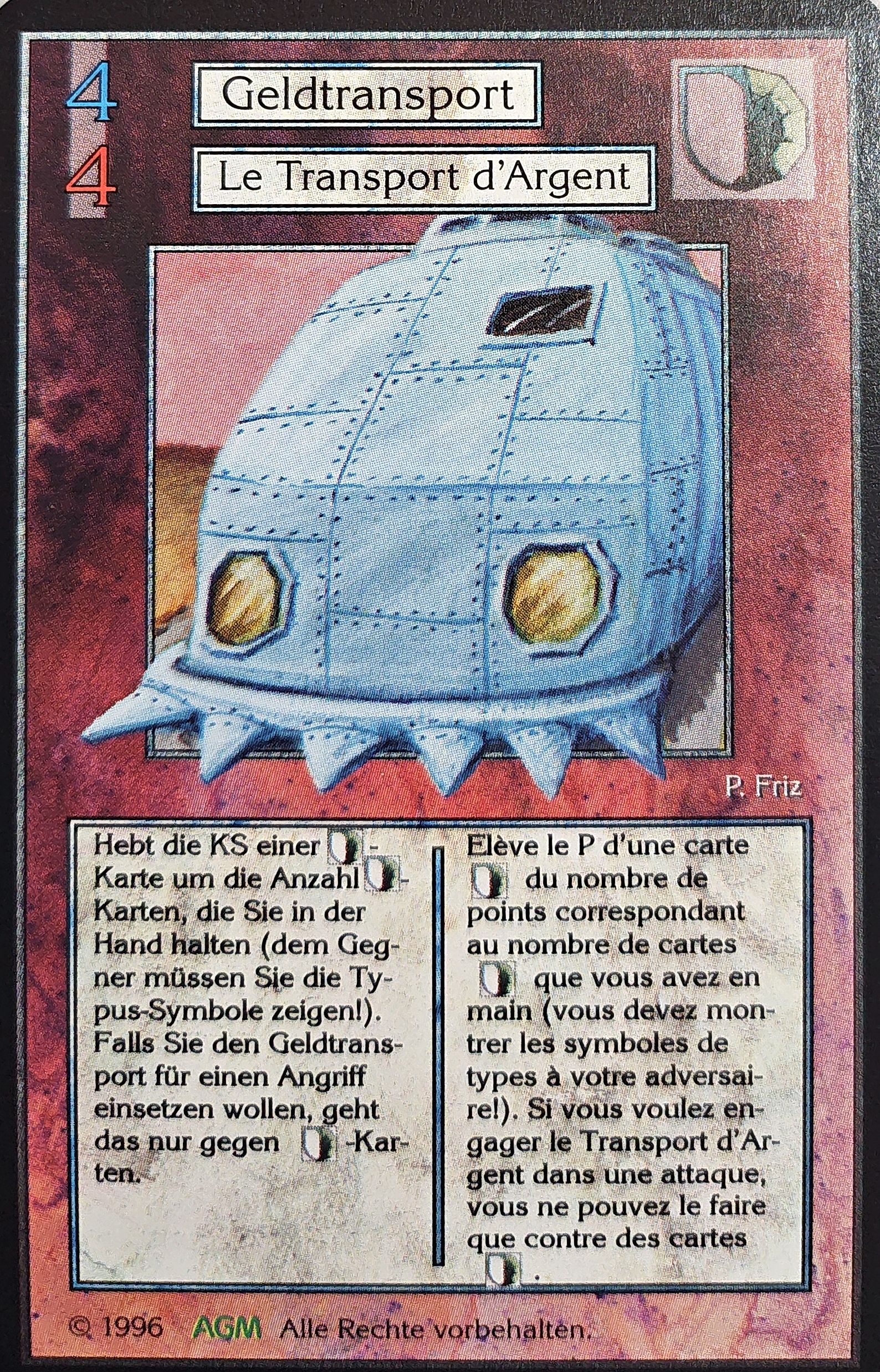 | Hebt die KS einer Karte um die Anzahl Karten, die Sie in der Hand halten (dem ner müssen Sie die pus-Symbole zeigenl) Falls Sie den Geldtrans - port für einen Angriff einsetzen wollen, das nur gegen ~Kar geht | Elève le P d’une carte du nombre de points correspondant au nombre de cartes que vous avez en main (vous devez mon trer les symboles de types à votre adversai rel) . Si vous voulez en gager le Transport dAr- gent dans une attaque, vous ne pouvez le faire que contre des cartes |
