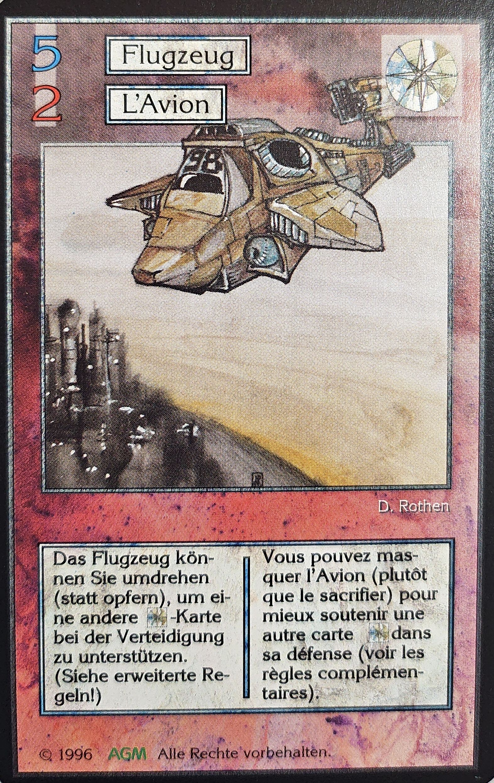 | Das Flugzeug kön- nen Sie umdrehen (statt opfern) , um ei ne andere Karte bei der Verteidigung zu unterstützen. (Siehe erweiterte Re- gelnl) | Rothen Vous pouvez mas- quer 1Avion (plutôt que le sacrifier) pour mieux soutenir une autre carte dans sa défense (voir les règles complémen taires) |