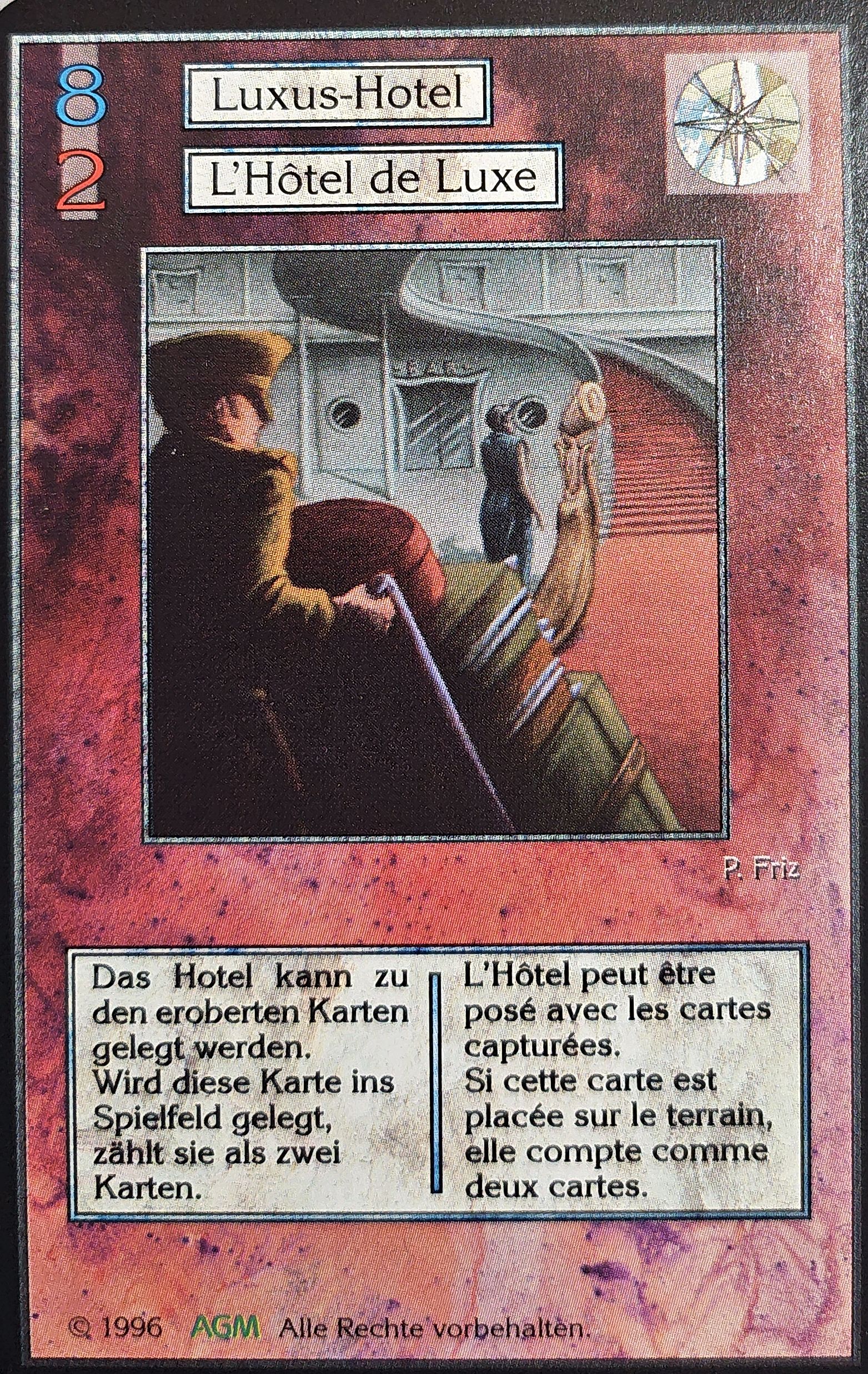 | Hotel kann den eroberten Karten gelegt werden. Wird diese Karte ins Spielfeld gelegt, zählt sie als zwei Karten: | P Friz L’Hôtel peut être posé avec les cartes capturées. Si cette carte est placée sur le terrain_ elle compte comme deux cartes. |