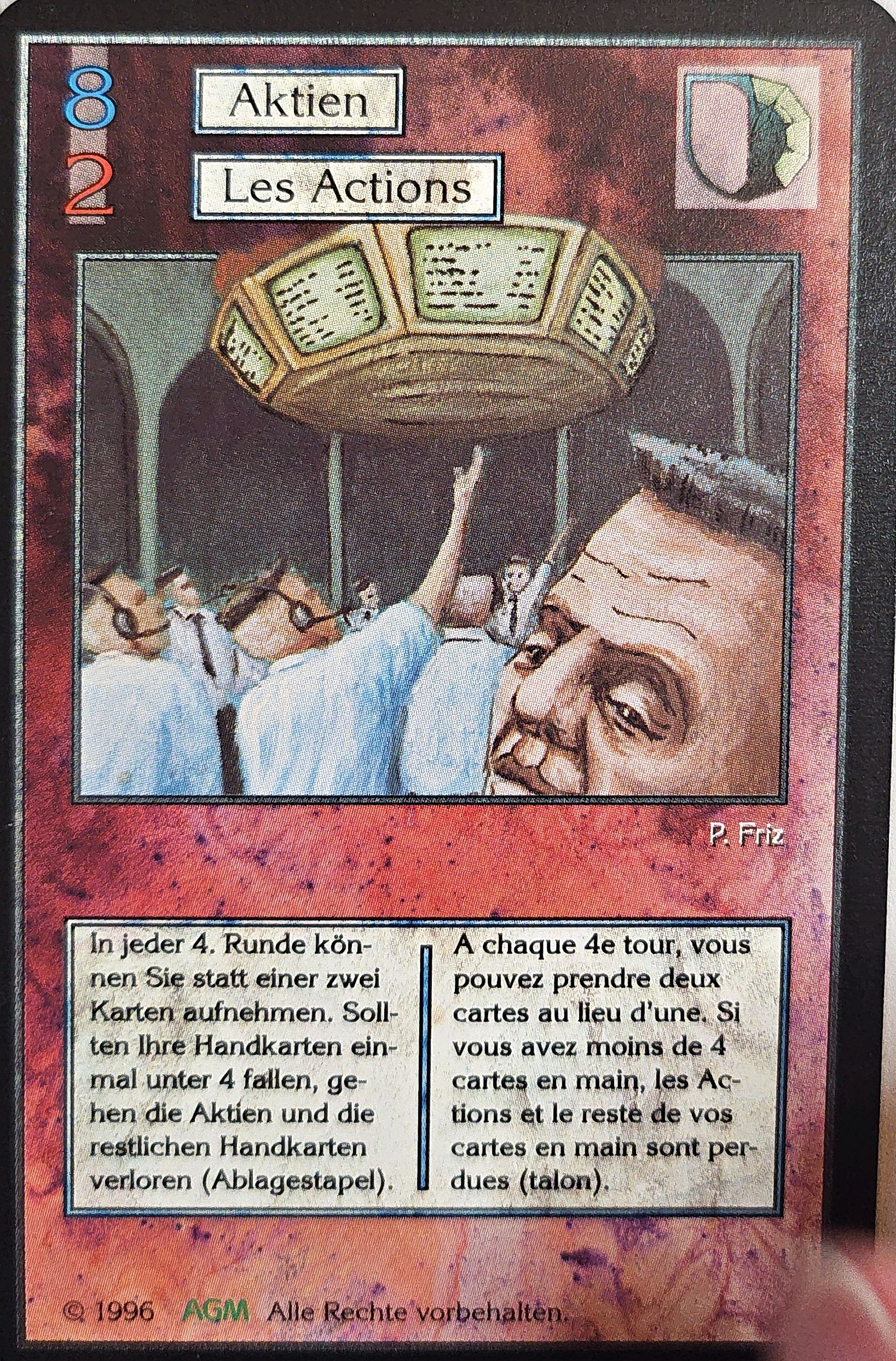 | In jeder 4. Runde kön- nen Sie statt einer zwei Karten aufnehmen. Soll ten Ihre Handkarten ein- mal unter 4 fallen, ge- hen die Aktien und die restlichen Handkarten verloren (Ablagestapel) | P Friz A chaque 4e tour, vous pouvez prendre deux cartes au lieu d’une. Si vous avez moins de 4 cartes en main les Ac- ions et le reste de vos cartes en main sont per lues (talon) |